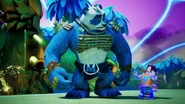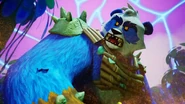Pandamonium boasts a predominantly blue fur color, with white serving as a secondary hue. It is adorned in bamboo armor that features shades of brown and olive-green. He has spikes on his wrists and wears a dark blue toga with the "M" symbol on it. He is also a giant & larger than most dream creatures, animals, people & dream crafts.